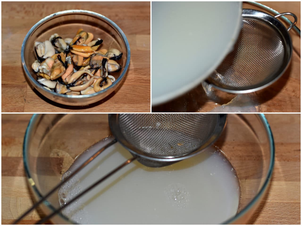 Sgusciate le cozze e tenetele da parte, coprendole con il fondo di cottura dopo averlo filtrato.