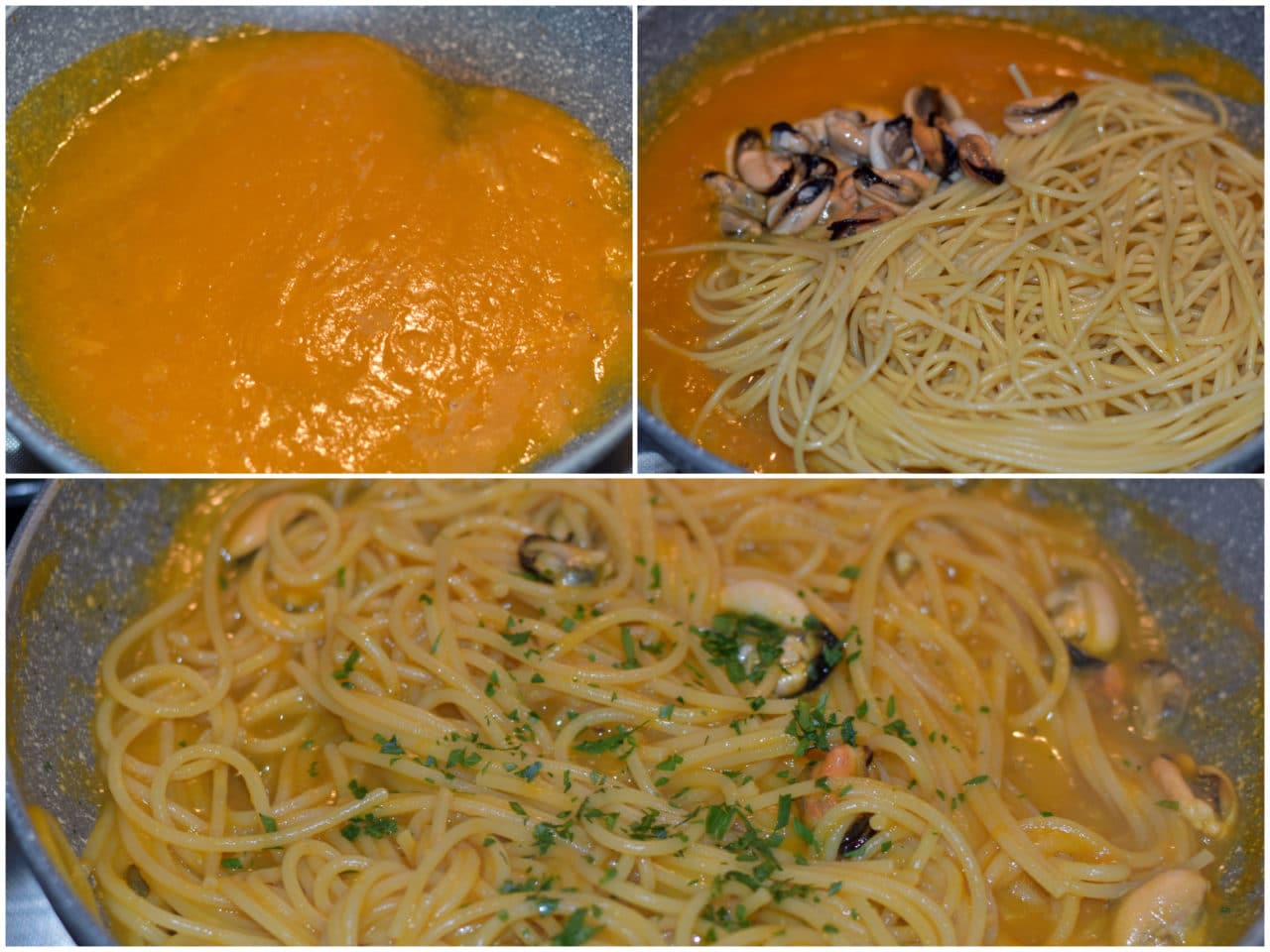 Cuocete la pasta in abbondante acqua leggermente salata, scolatela al dente e ripassatela velocemente in padella con la crema di zucca e le cozze con tutto il fondo di cottura.