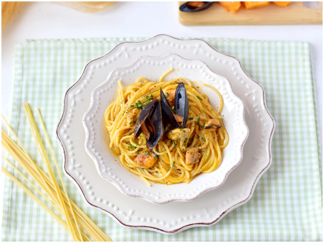 Spaghetti con zucca e cozze