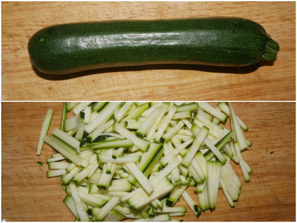 Mondate le verdure, tritate la cipolla, tagliate carote e zucchine a bastoncini, affettate il peperone a listarelle, sciacquate i germogli di bambù.