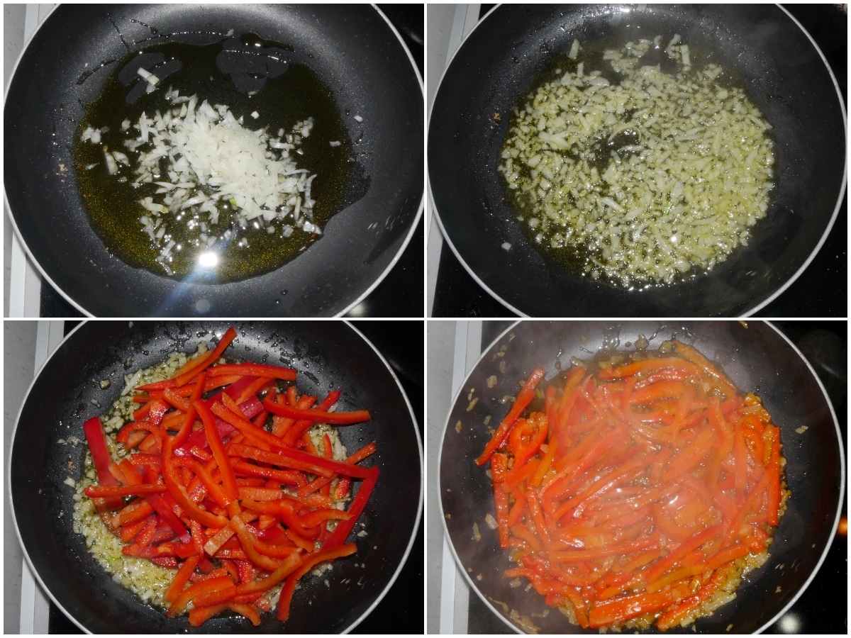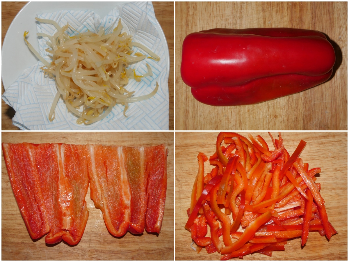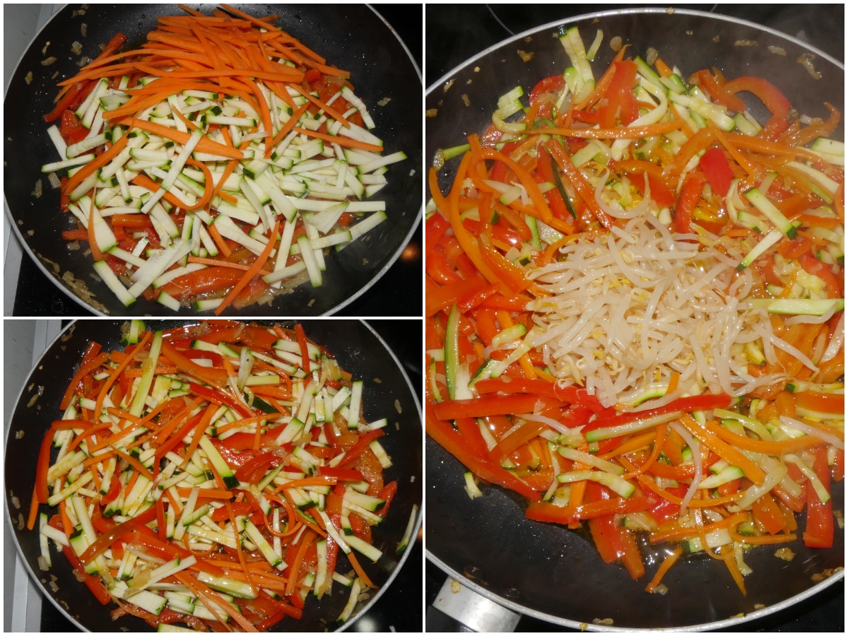 Fate appassire la cipolla in un'ampia padella antiaderente con olio, quindi unite prima i peperoni; lasciate insaporire velocemente, poi aggiungete anche carote e zucchine e lasciate cuocere per qualche minuto, quindi aggiungete i germogli.