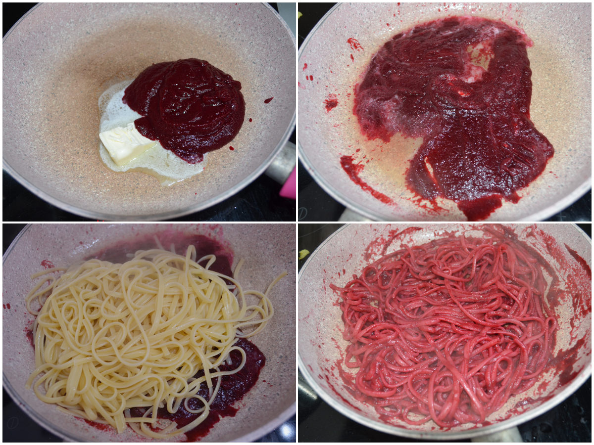 Nel frattempo cuocete la pasta in acqua bollente già salata, scolatela al dente, quindi aggiungetela alla crema di barbabietola e mescolate.