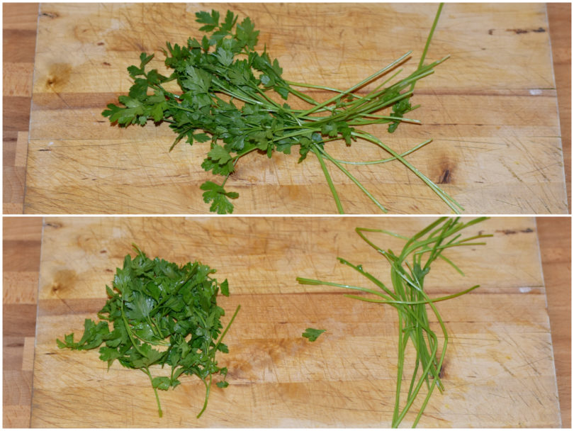 Nel frattempo preparate gli altri ingredienti, lavate il prezzemolo e tritatelo, lasciando i gambi interi da parte.