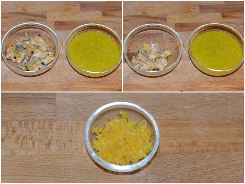 Sgusciate le vongole (potete tenerne qualcuna con il guscio da parte per decorare i piatti) e filtrate il fondo di cottura, eliminando aglio e gambi di prezzemolo.
