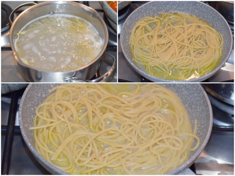 Cuocete gli spaghetti in abbondate acqua bollente poco salata e scolateli molto al dente.