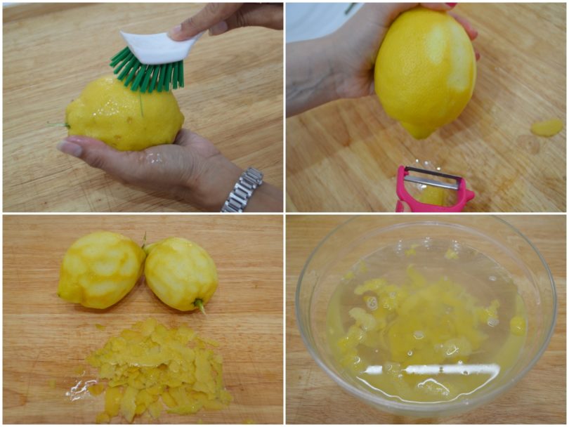 Innanzitutto lavate bene i limoni con uno spazzolino sotto l'acqua corrente, quindi ricavate le bucce da 2 dei 3 limoni con un pelapatate (senza prendere la parte bianca) e lasciatele in infusione nell'acqua per tutta la notte.