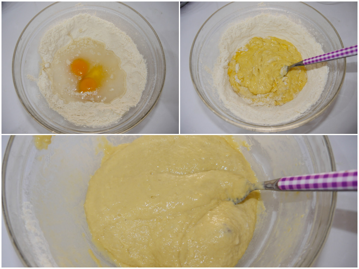 Mettete la farina a fontana in una ciotola, versate al centro uova, sale e acqua tiepida e impastate velocemente con la forchetta: dovrete ottenere un impasto colloso, non troppo liquido ma neanche troppo denso.