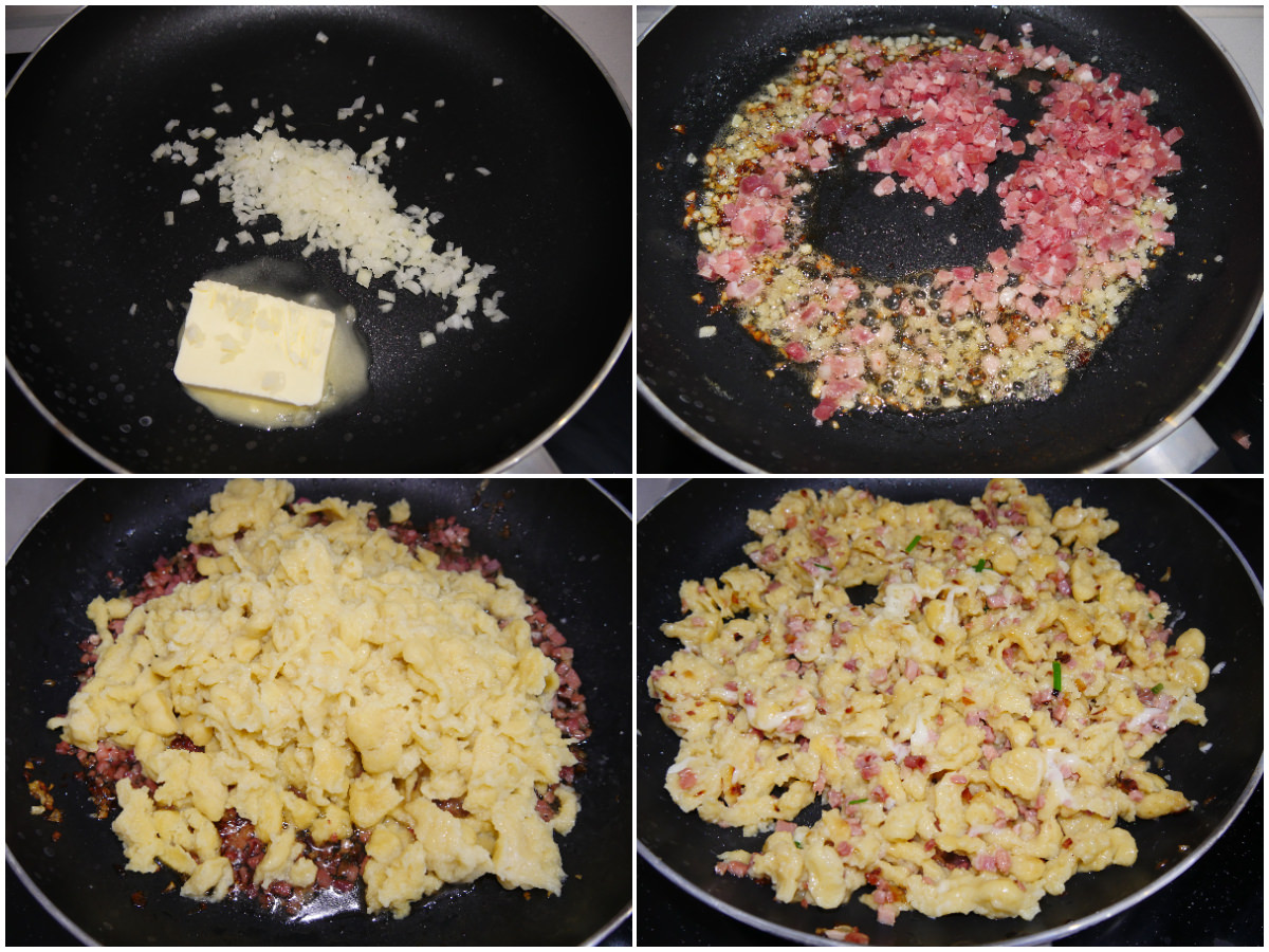 Quando gli spätzle saranno cotti, man mano che li scolate versateli direttamente nella padella con il condimento e insaporite con formaggio grattugiato ed erba cipollina.