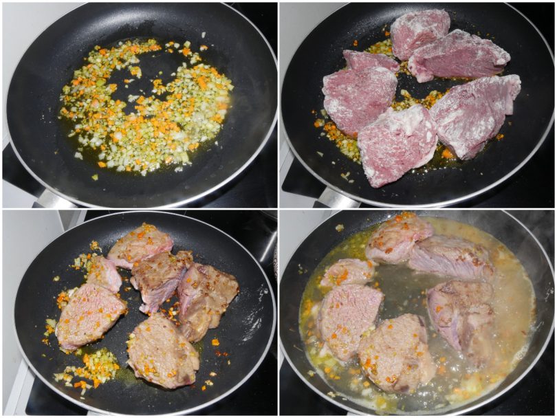 Preparate un trito di carota, cipolla e prezzemolo e fatelo appassire in una padella dai bordi alti insieme ad un po' d'olio. Aggiungete la carne e fatela rosolare in padella per sigillare bene i succhi all'interno della carne.