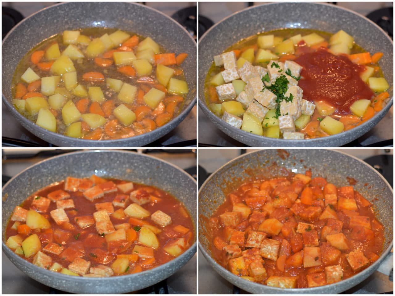 Unite anche tempeh a tocchetti, passata di pomodoro, prezzemolo tritato e lasciate cuocere per 15 minuti a fiamma bassa, quindi aggiustate di sale.