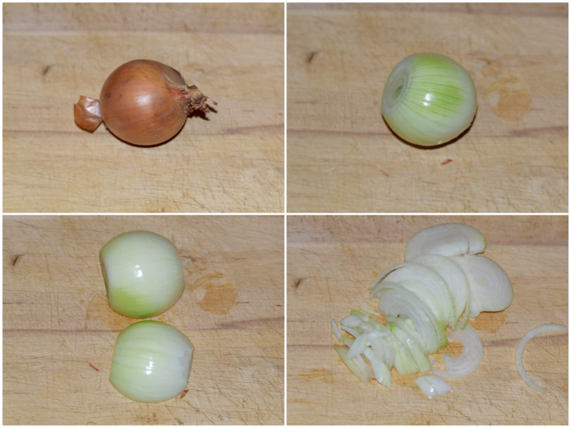 Mondate aglio e cipolla, tritate il primo e tagliate la seconda a fettine sottili.