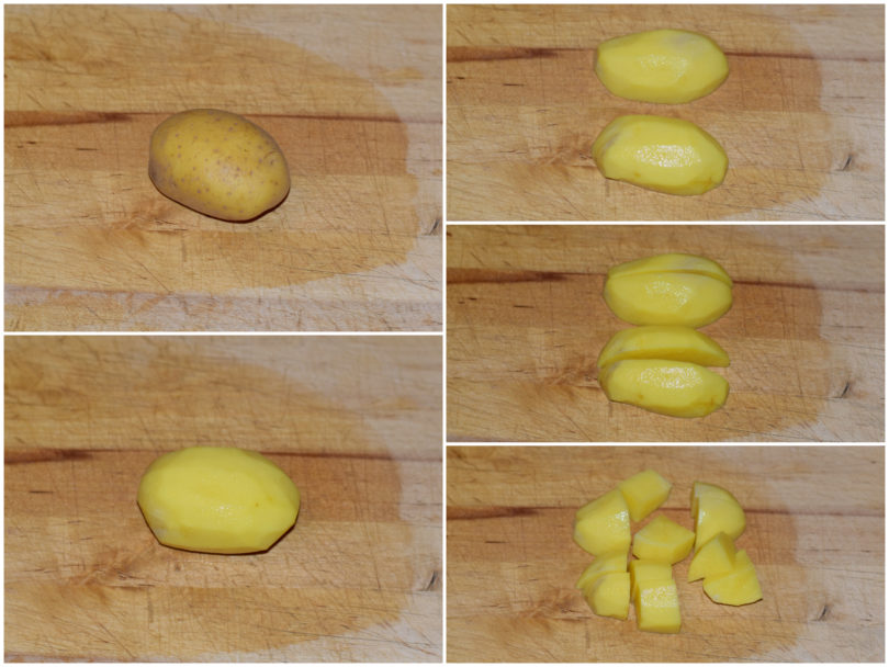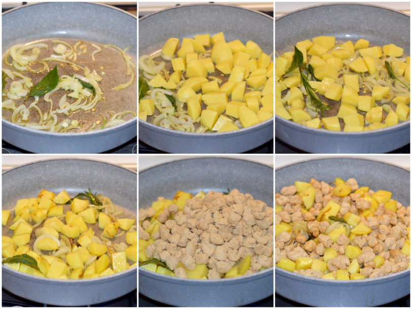 Nel frattempo pelate e lavate le patate, tagliatele a tocchetti e aggiungetele nel tegame.