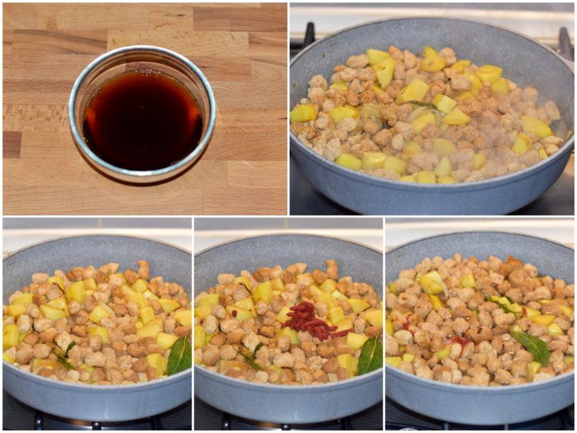 Unite salsa di soia e vino bianco e usateli per sfumare lo spezzatino, poi aggiungete anche concentrato di pomodoro e pepate.