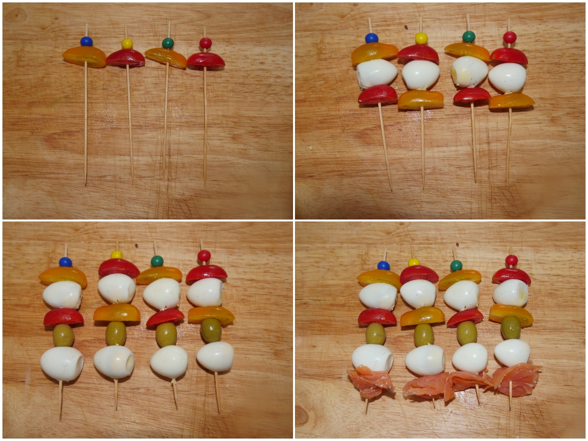 Assemblate i vostri spiedini, alternando a piacere pomodorini, uova, olive e salmone.
