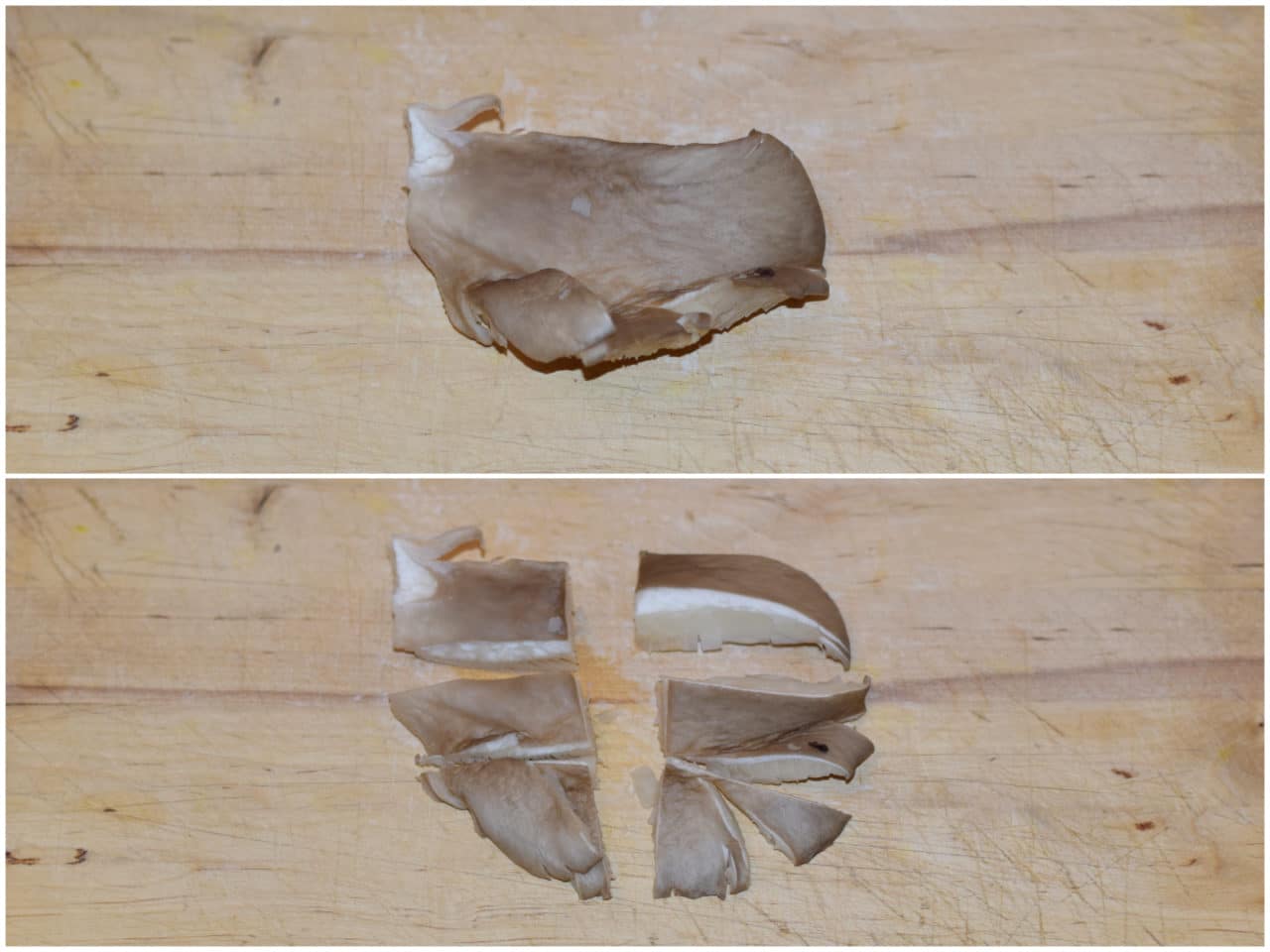 Mondate i pleurotus eliminando delicatamente il terriccio, poi tagliateli a tocchetti.
