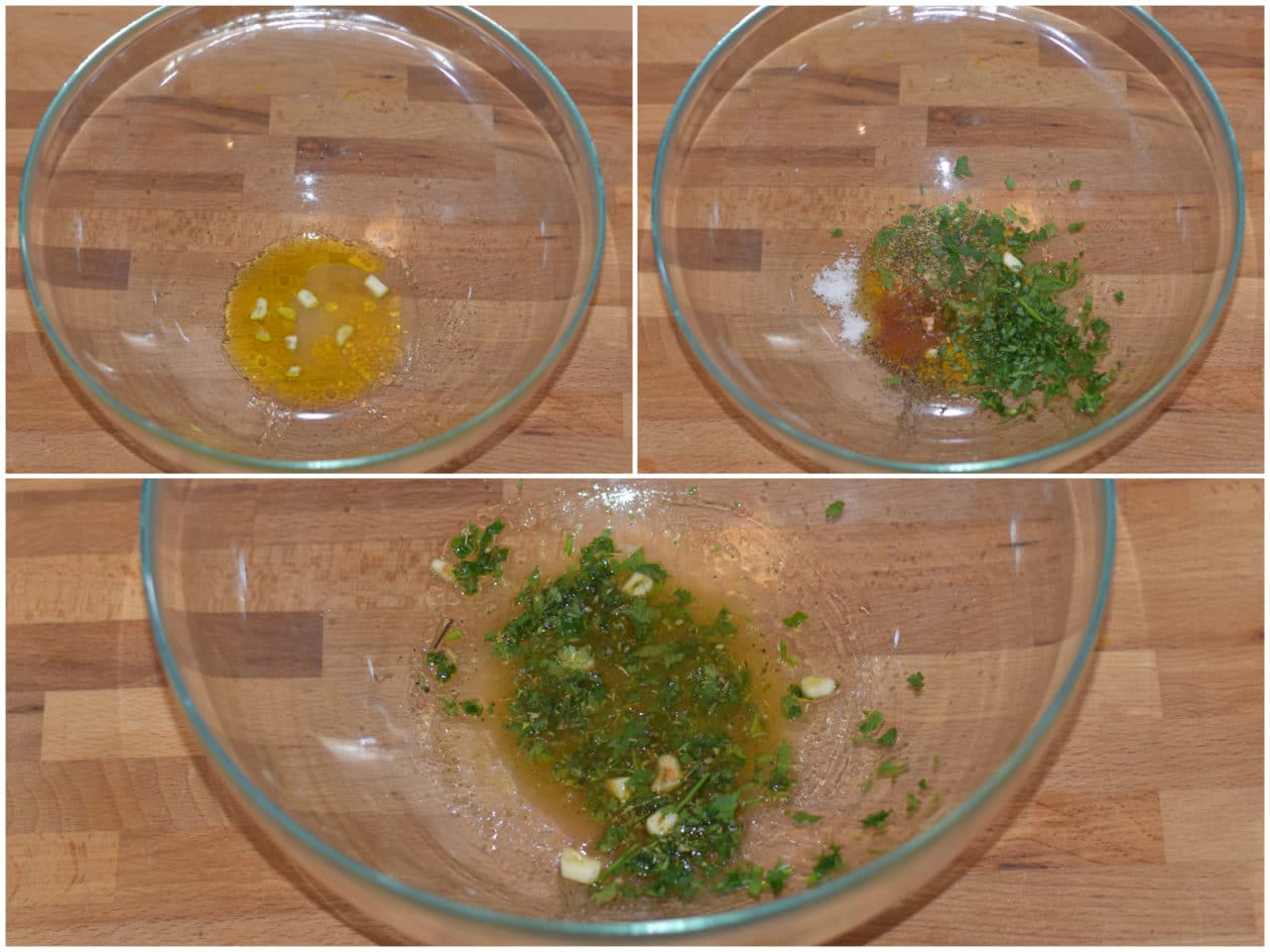 Preparate la marinatura mescolando olio, aglio, succo di limone, sciroppo d'acero, origano, prezzemolo tritato, sale e pepe in una ciotola capiente.