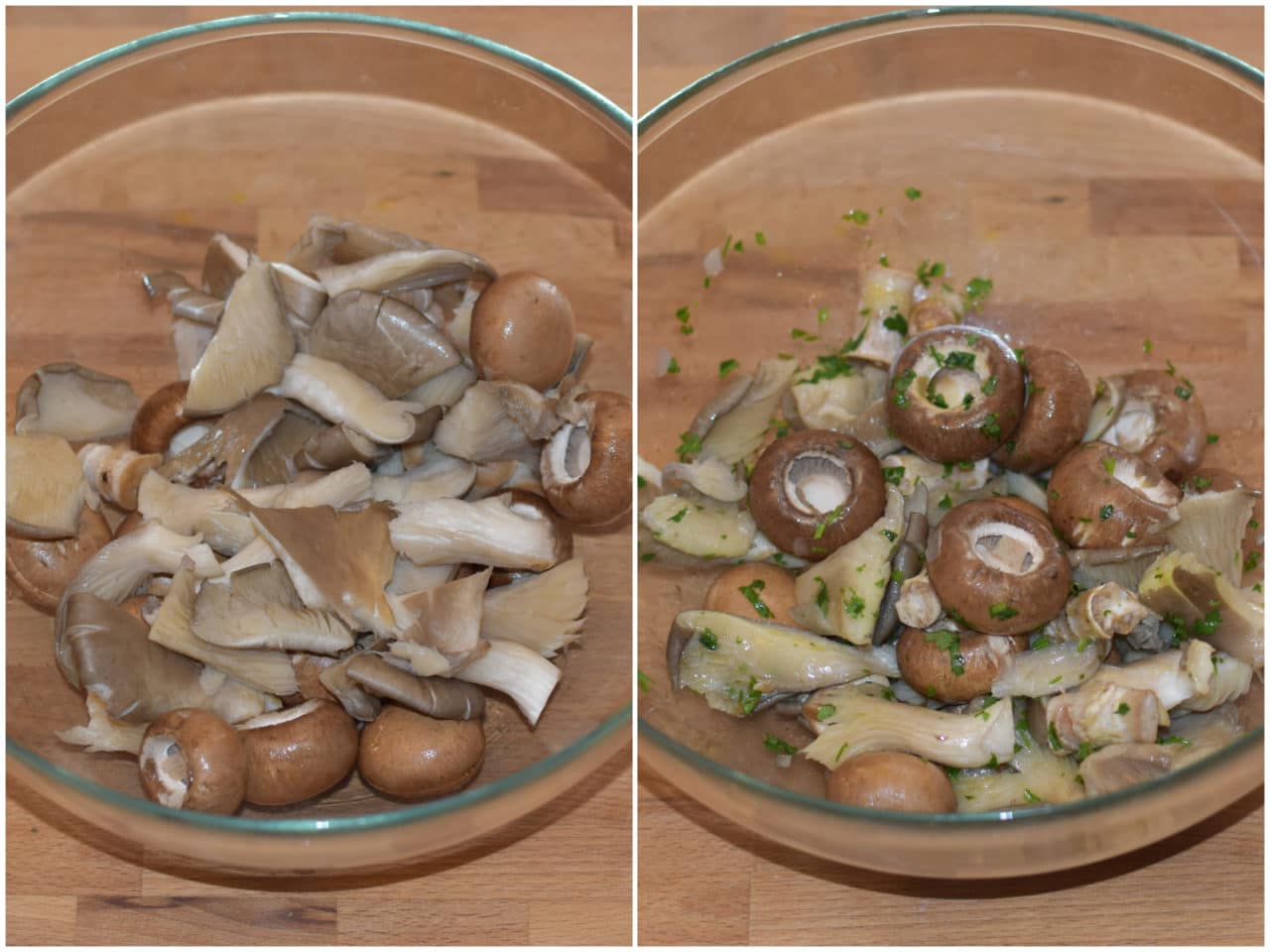 Unite tutti i funghi nella ciotola e mescolate delicatamente, quindi lasciate riposare per 1 ora a temperatura ambiente.