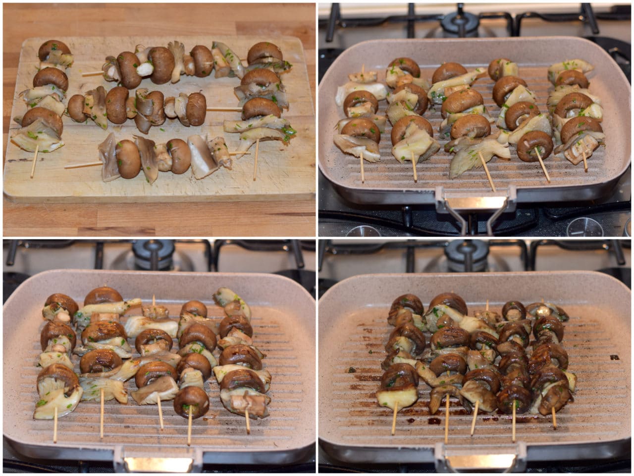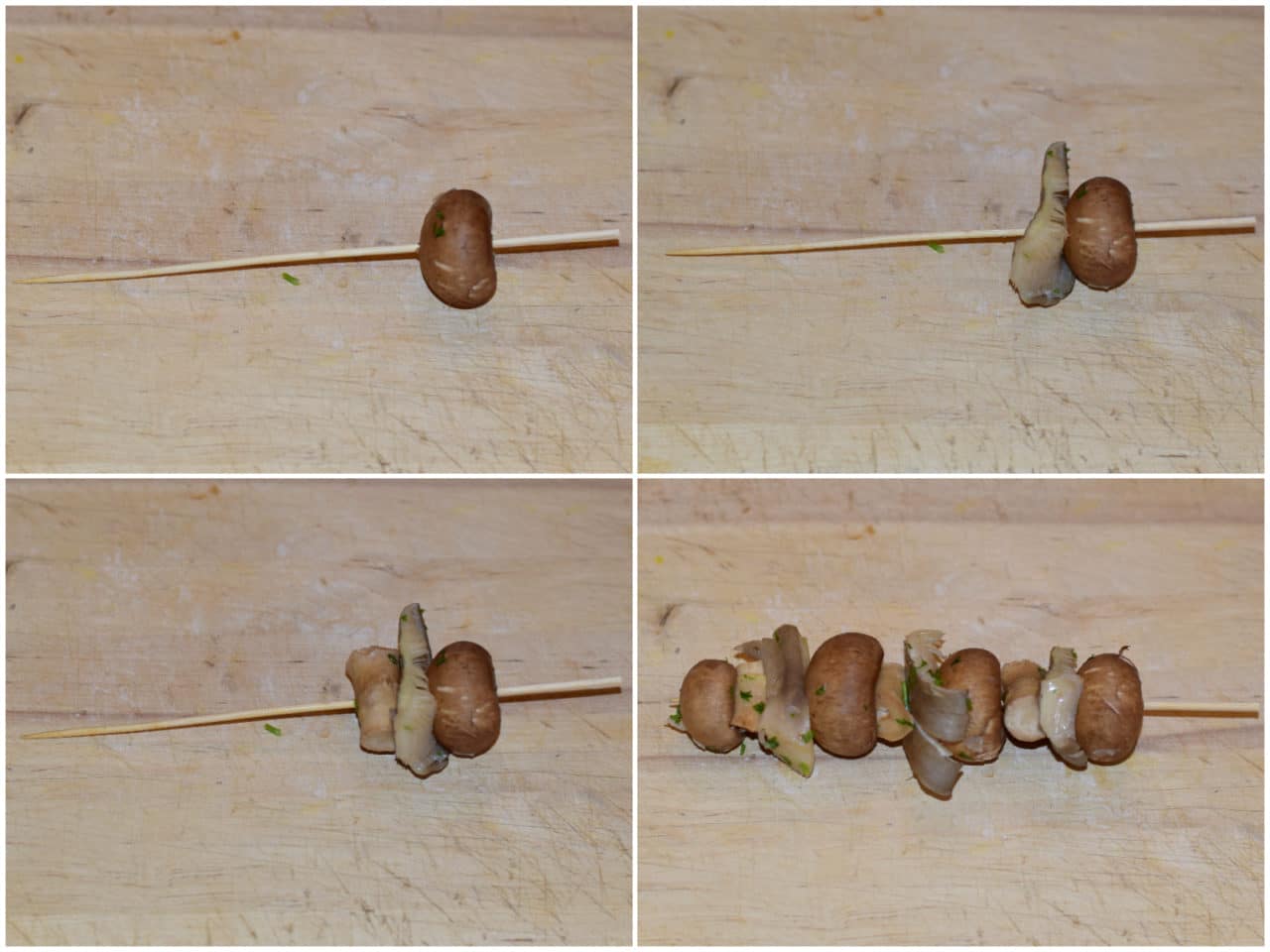 Assemblate gli spiedini alternando champignon e pleurotus.