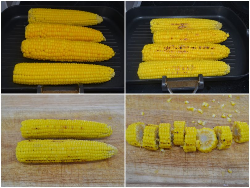 Scolate le pannocchie e grigliatele su una bistecchiera ben calda per pochi minuti, quindi tagliatele a rondelle.