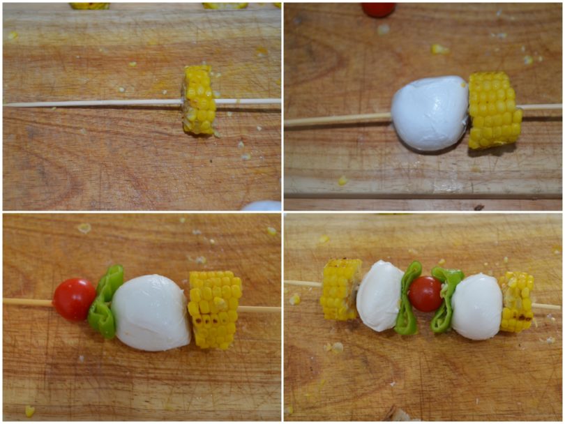 Assemblate quindi gli spiedini alternando le rondelle di pannocchia con mozzarella, pomodorini e peperoncini.