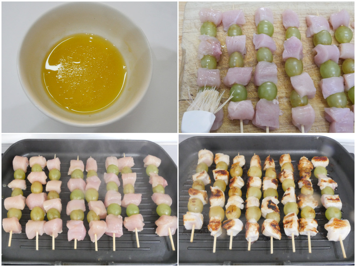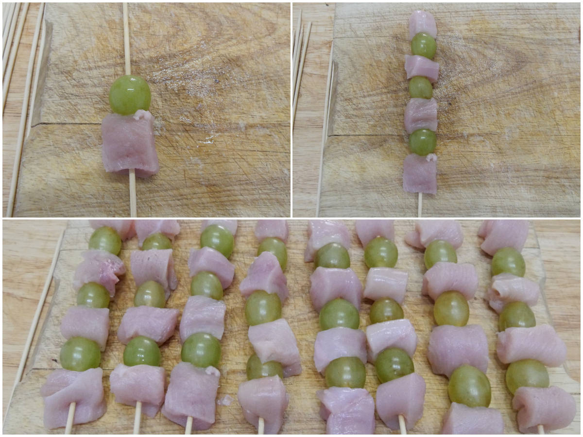 Assemblate gli spiedini, alternando un tocchetto di pollo e un chicco di uva.