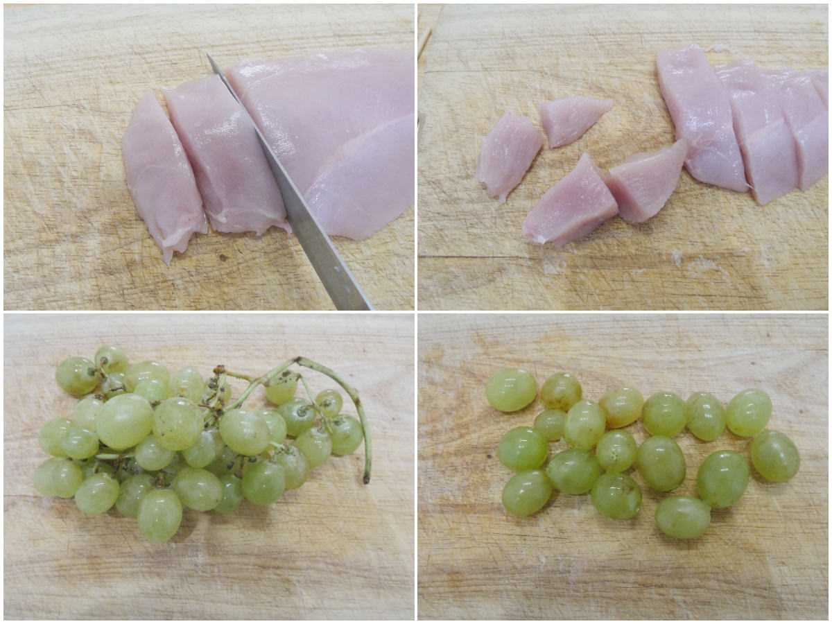Innanzitutto tagliate il pollo a tocchetti, quindi lavate bene l'uva ed eliminate il raspo.