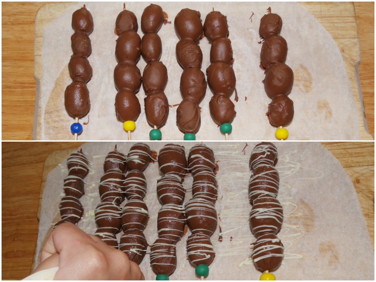 lasciate riposare in frigo per circa 1 ora o finché il cioccolato non sarà completamente asciutto, quindi decorateli con il cioccolato bianco sciolto, usando una sac-à-poche con il beccuccio molto piccolo.