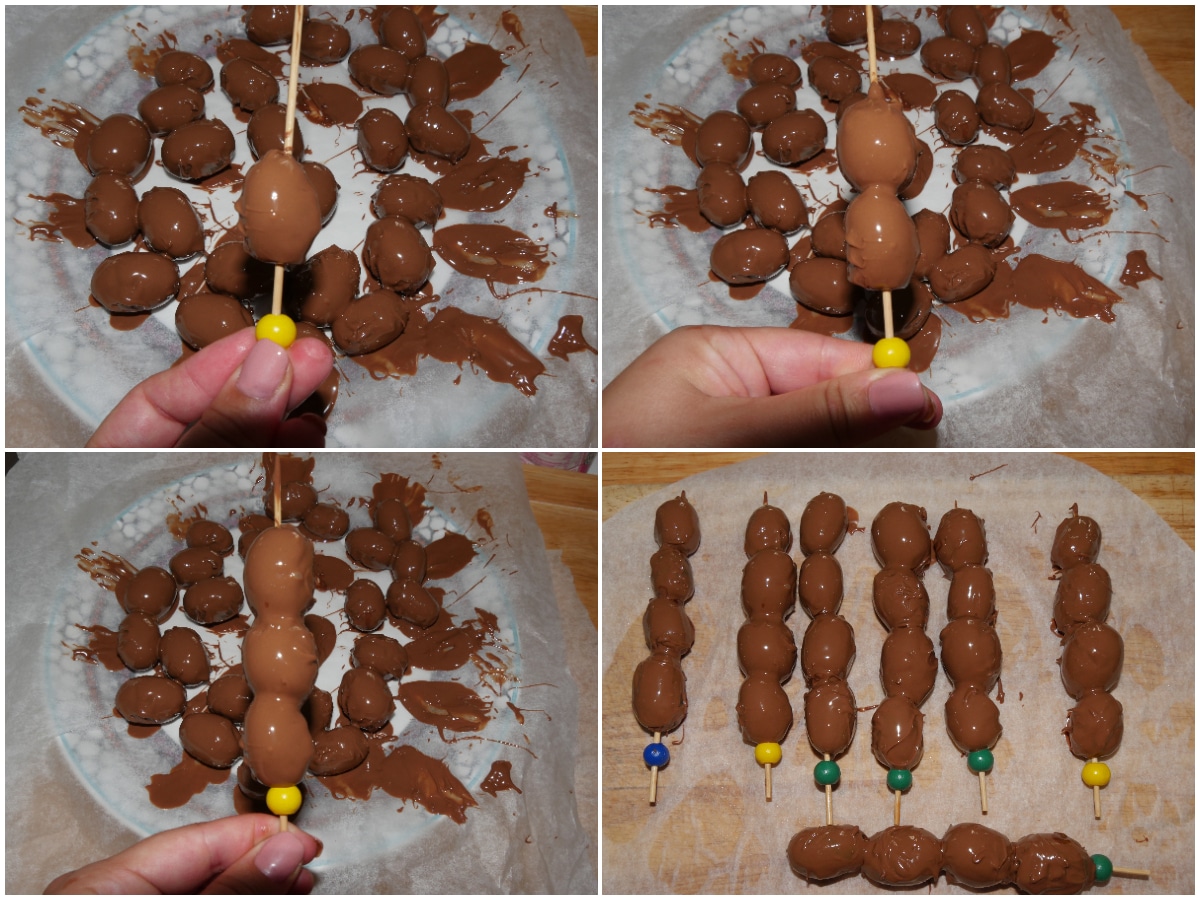 Uno per volta, infilzate i vostri acini al cioccolato sugli spiedini, poggiandoli poi su un foglio di carta forno pulito.