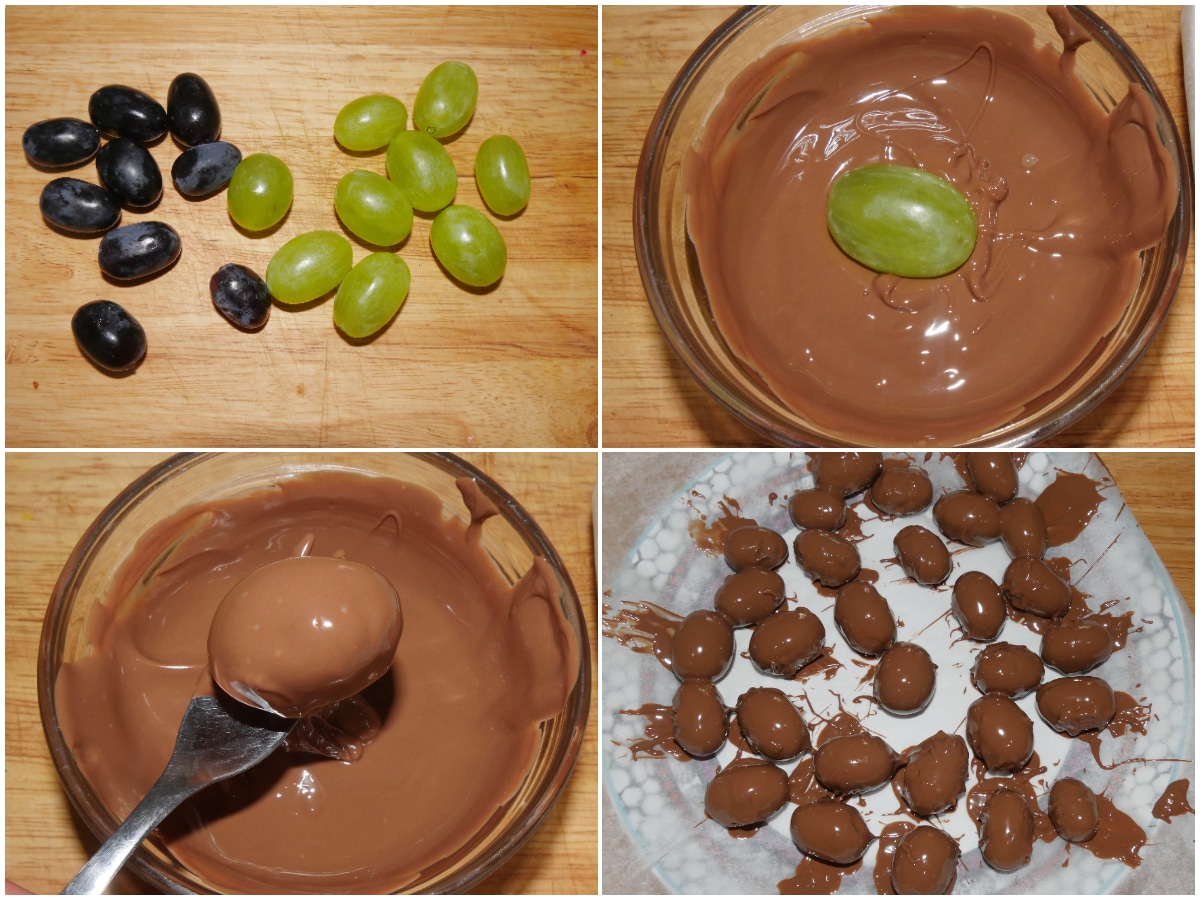 Innanzitutto lavate e asciugate bene l'uva, quindi sciogliete il cioccolato (io ho usato quello al latte, ma va bene anche quello fondente o quello bianco: se usate quest'ultimo, però, dovrete cambiare tipo di cioccolato per la decorazione, naturalmente) in microonde (o a bagnomaria).