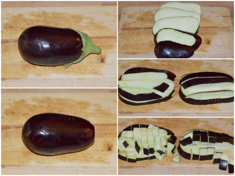 Lavate e mondate la melanzana, poi tagliatela a cubetti non troppo piccoli (circa 2-3 cm per lato).