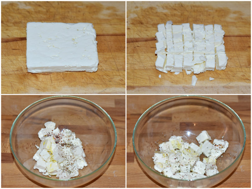 Tagliate la feta a cubetti cercando di replicare le dimensioni dei cubetti di melanzana, metteteli in una ciotola e condite con peperoncino, olio, limone e origano.
