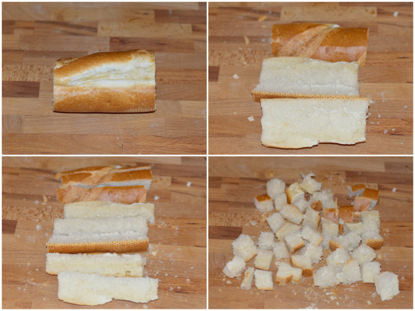 Tagliate anche il pane a cubetti, sempre delle stesse dimensioni.