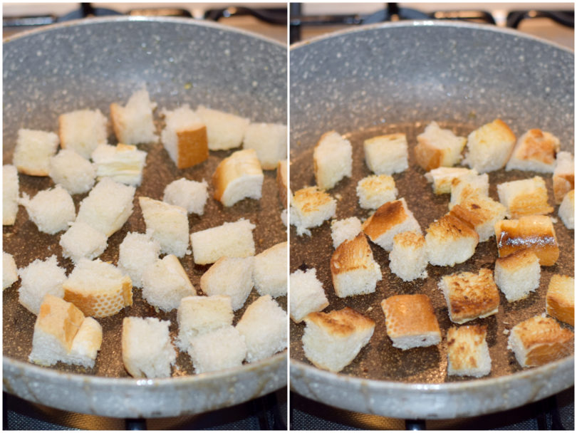 Fate rosolare il pane nella stessa padella di prima, condendolo con un filo d'olio e rigirando spesso, fino a doratura.