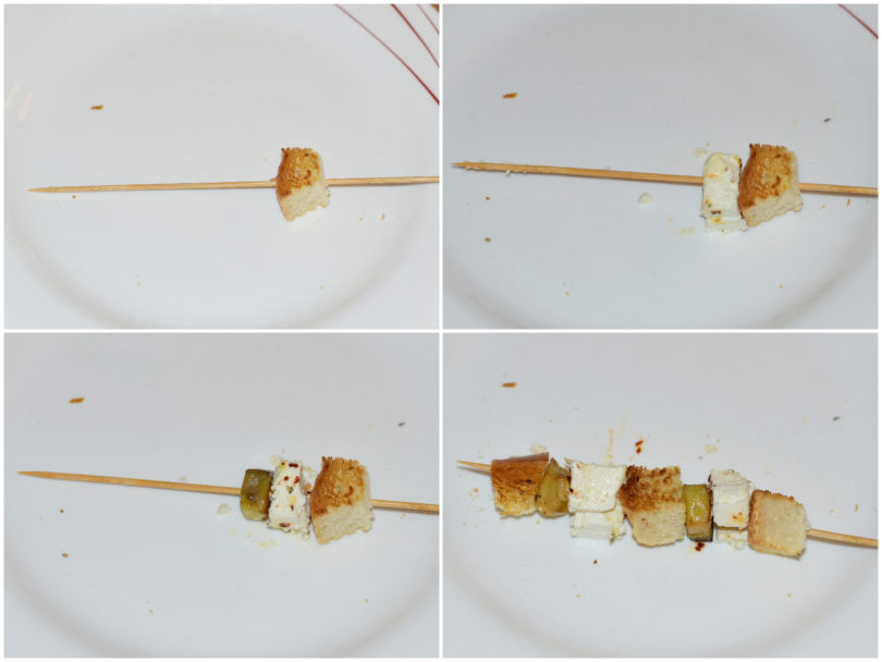 Componete gli spiedini alternando pane, feta e melanzana sugli stecchini.