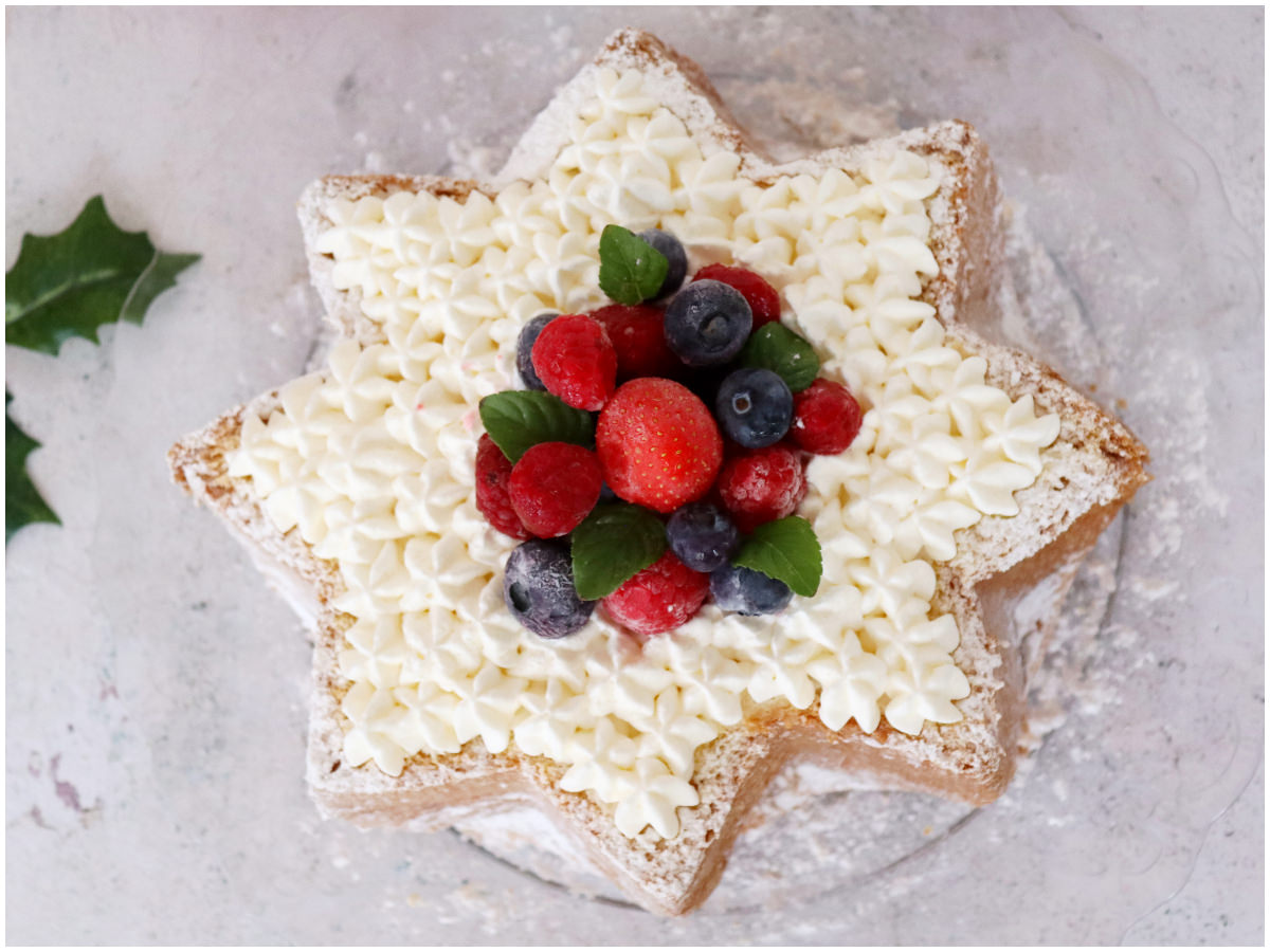 La stella di pandoro al mascarpone è pronta: aspettate l'ultimo momento per decorarla con frutti di bosco freschi e zucchero a velo (ma potete usare anche cacao amaro, gocce di cioccolato, frutta secca o altro a piacere).