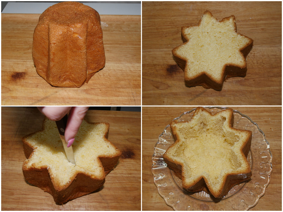 Tagliate via la cima del pandoro, a 10 cm circa dalla base, quindi scavatene via la mollica lasciando un guscio di un paio di cm.