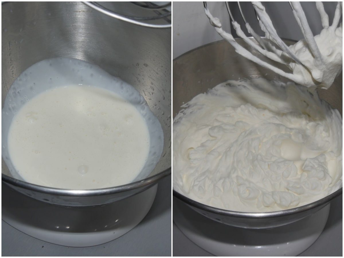 A parte, lavorate il mascarpone con lo zucchero, quindi incorporate delicatamente anche la panna, con un movimento dal basso verso l'alto.