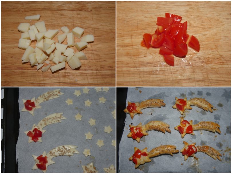 Ricoprite le stelline di pasta sfoglia con i pezzetti di pomodoro e con il formaggio. Spennellate con uovo battuto.