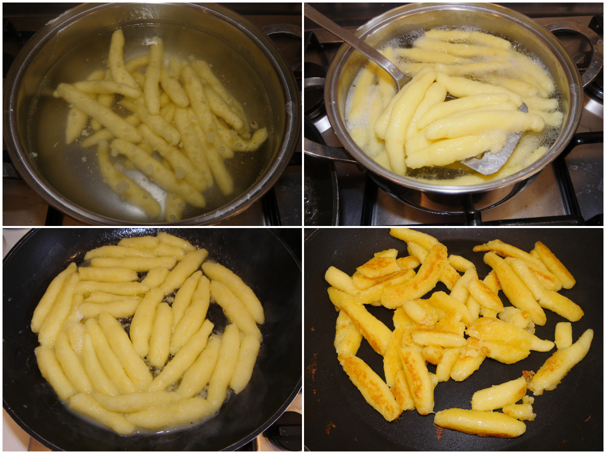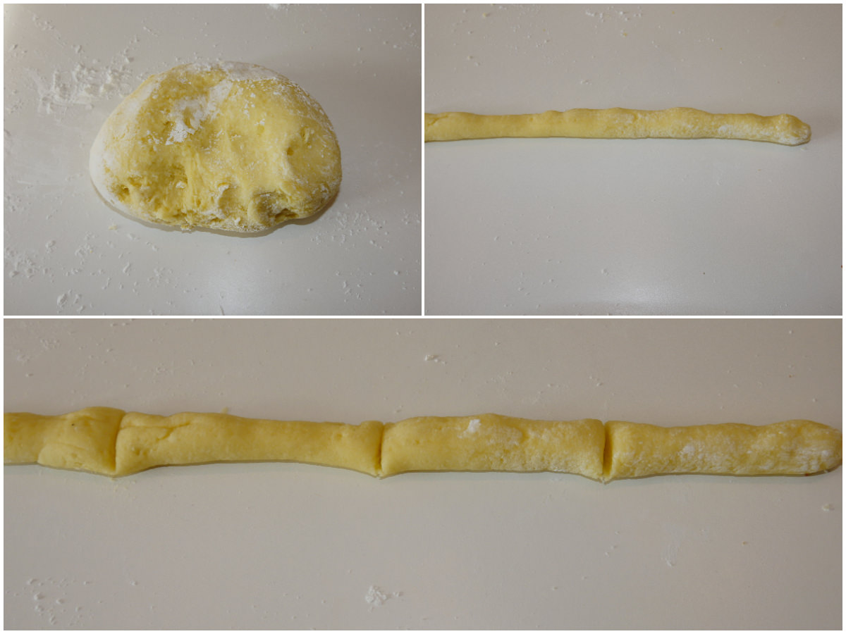 Create dei cordoncini di impasto del diametro di circa 2 cme ritagliate gli gnocchi di circa 5 cm.