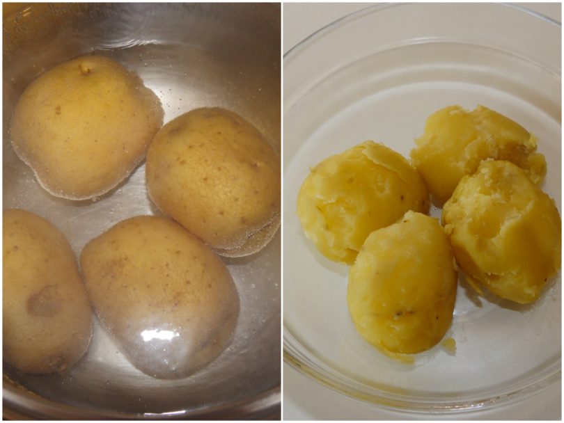 Innanzitutto lessate le patate: lavatele bene, mettetele in una pentola di acqua fredda, portate a bollore e cuocete circa 35 minuti o finché le patate non risulteranno ben morbide, quindi scolatele e pelatele.