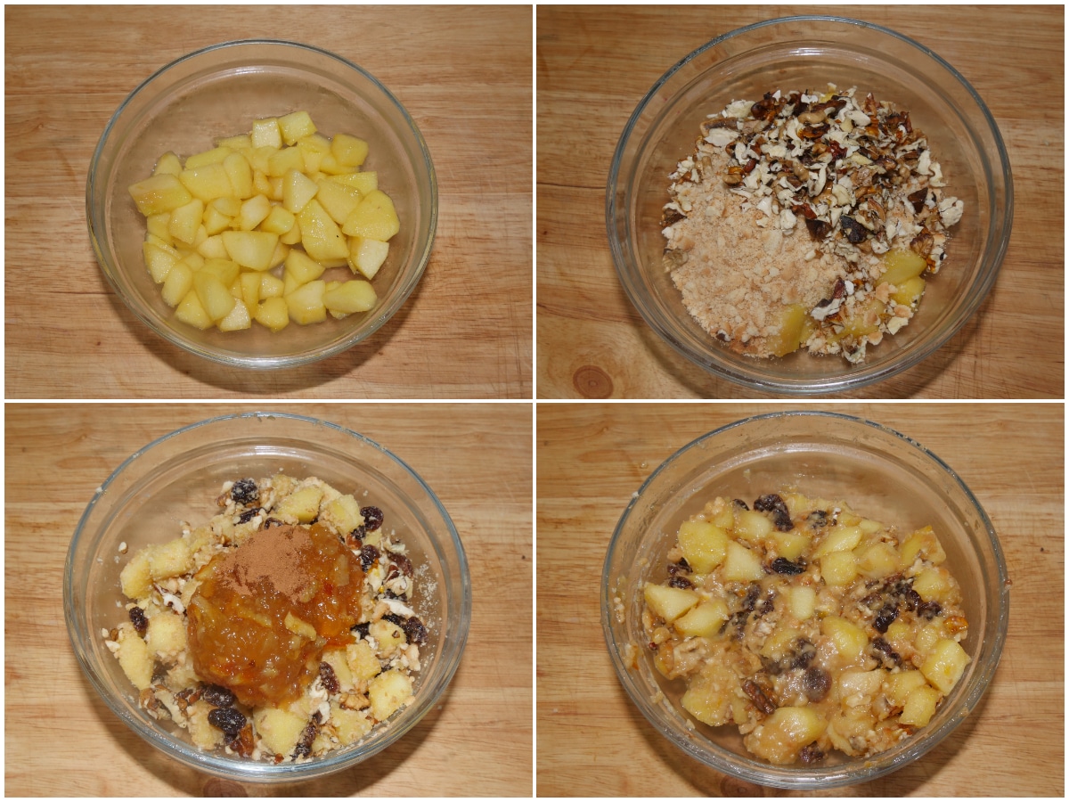 Trasferite le mele in una ciotola e aggiungete le noci tritate grossolanamente, i biscotti sbriciolati (per uno strudel meno dolce, sostituiteli con del pangrattato), l'uvetta scolata e strizzata delicatamente, cannella a piacere e la marmellata, e amalgamate.