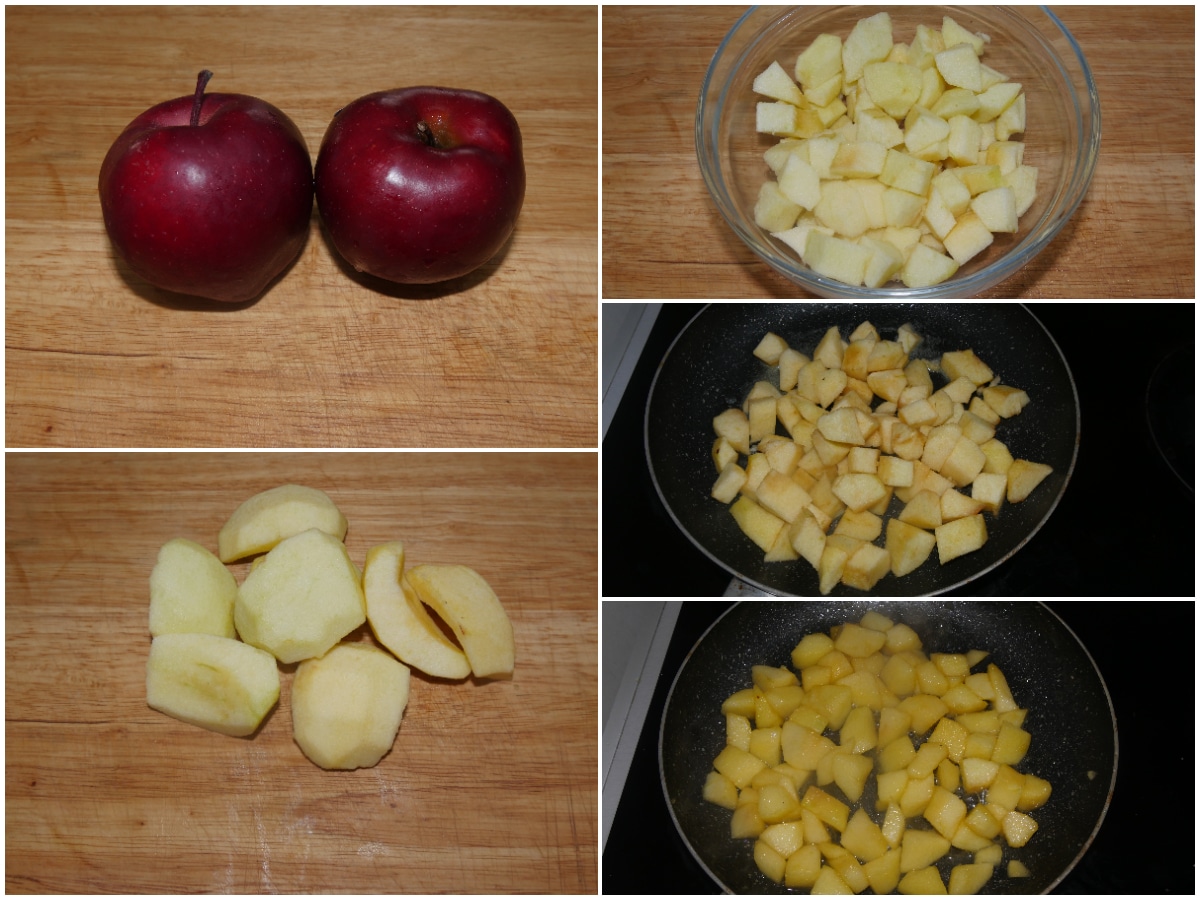 Lavate le mele, pelatele, eliminate il torsolo e tagliatele a cubetti, quindi saltatele in una padella antiaderente con burro, zucchero di canna e qualche goccia di succo di limone per pochi minuti, giusto il tempo di farle ammorbidire leggermente e insaporire.