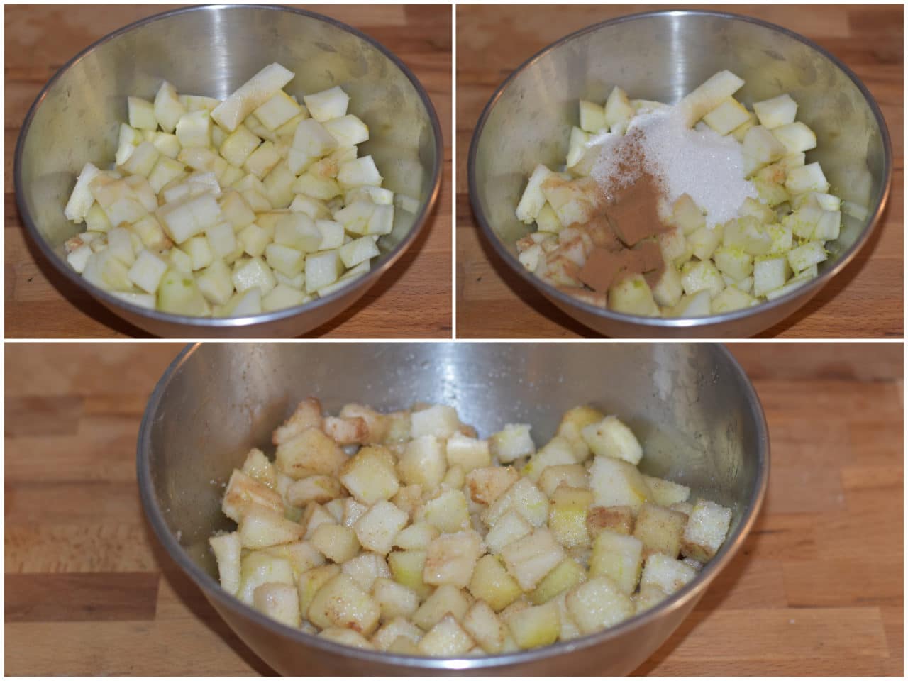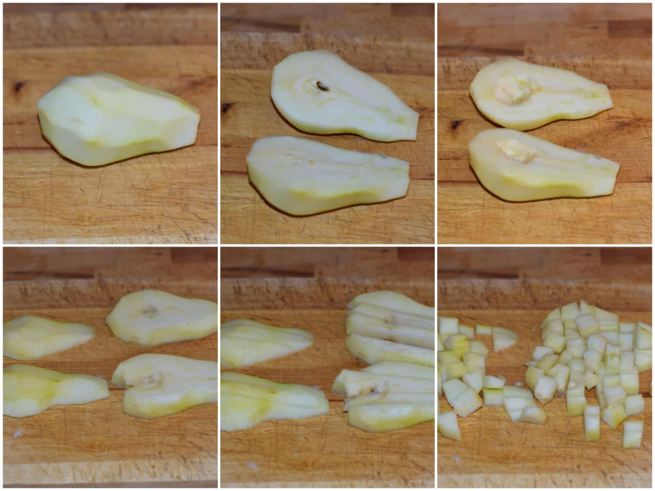 Nel frattempo preparate la farcitura: mondate le pere e tagliatele a cubettini.