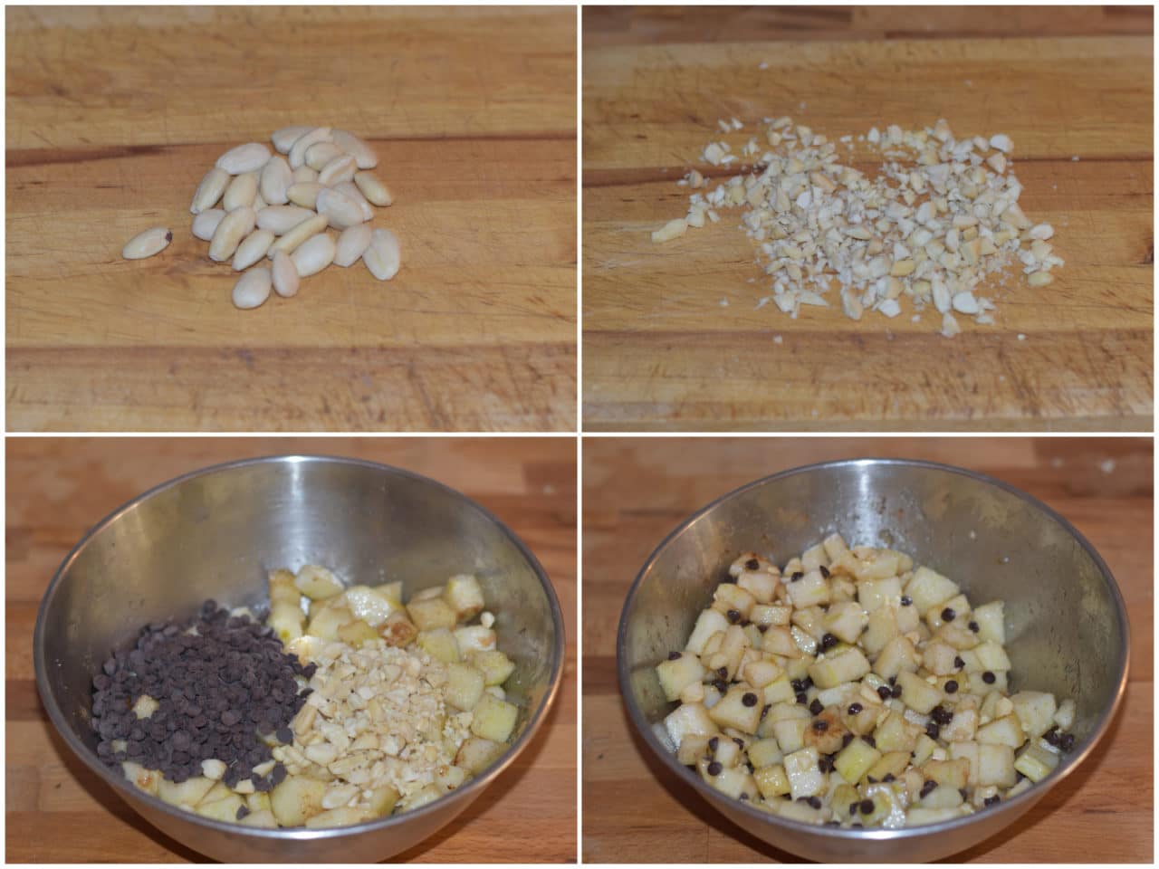 Tritate grossolanamente le mandorle e unitele alle pere insieme con il cioccolato.