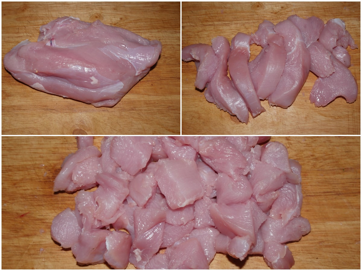 Innanzitutto tagliate il tacchino a tocchetti da circa 2-3 cm.