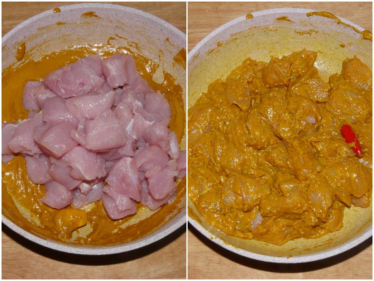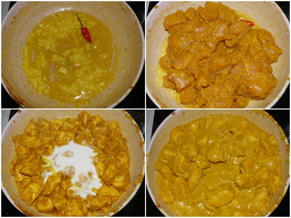 Fate soffriggere cipolla, zenzero e peperoncino con olio (potete usare la stessa padella in cui avete preparato la salsa al curry), quindi aggiungete anche il tacchino con tutta la salsa di marinatura.