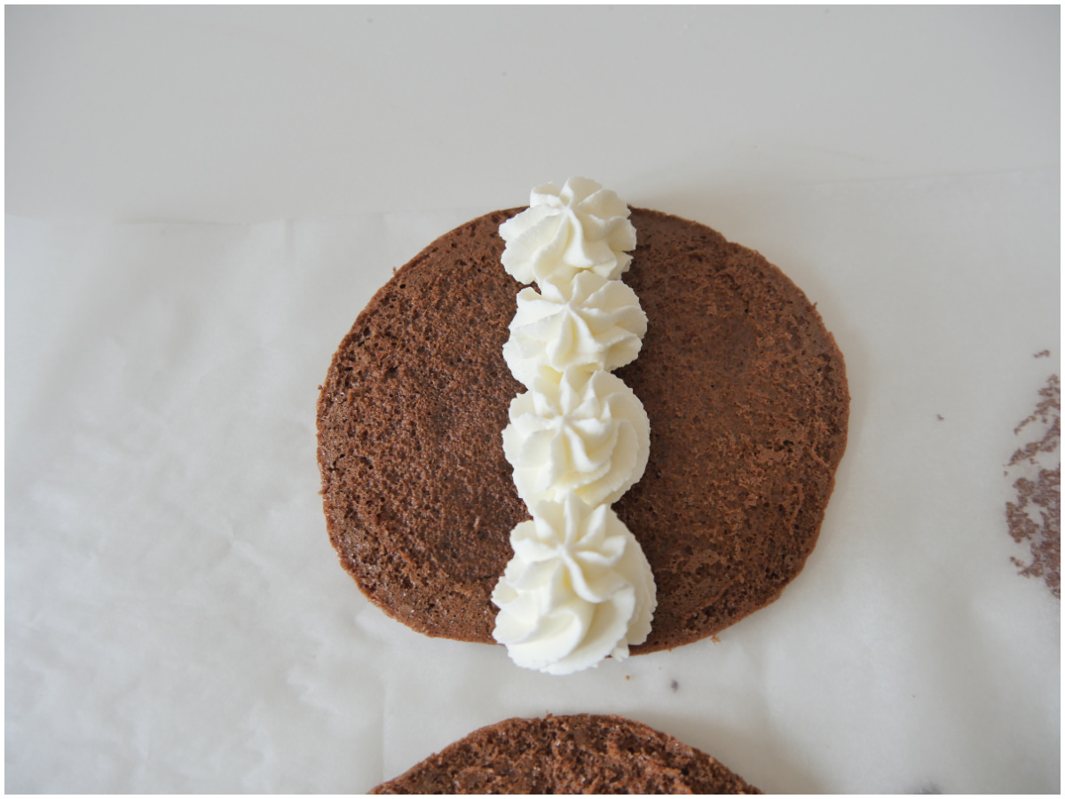 Nel frattempo montate la panna con la vaniglia e, quando i dischi saranno completamente freddi, apriteli delicatamente e mettete al centro un cucchiaino di nutella, poi decorate con i ciuffetti di panna e chiudete a mezzaluna.