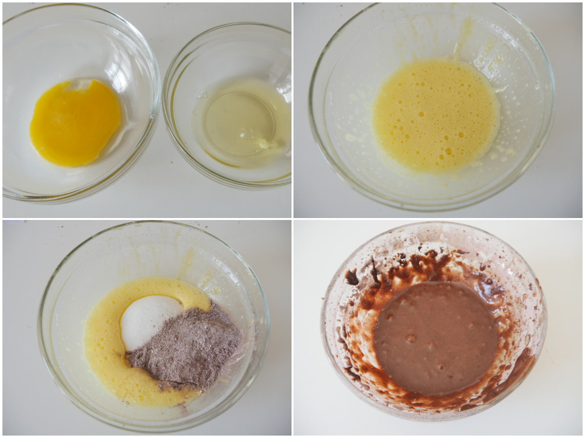 Innanzitutto separate tuorli e albumi e montate i primi con zucchero, vaniglia e sale, quindi unite anche il burro sciolto e poi farina, cacao e lievito setacciati.