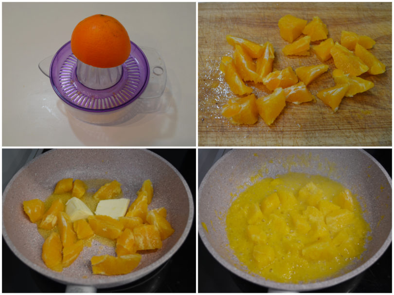Tagliate la polpa pelata a vivo in pezzi, eliminando i semini se necessario, metteteli in padella con olio e burro e sfumate con il succo di arancia, cuocendo finché la polpa non inizierà a sfarsi.