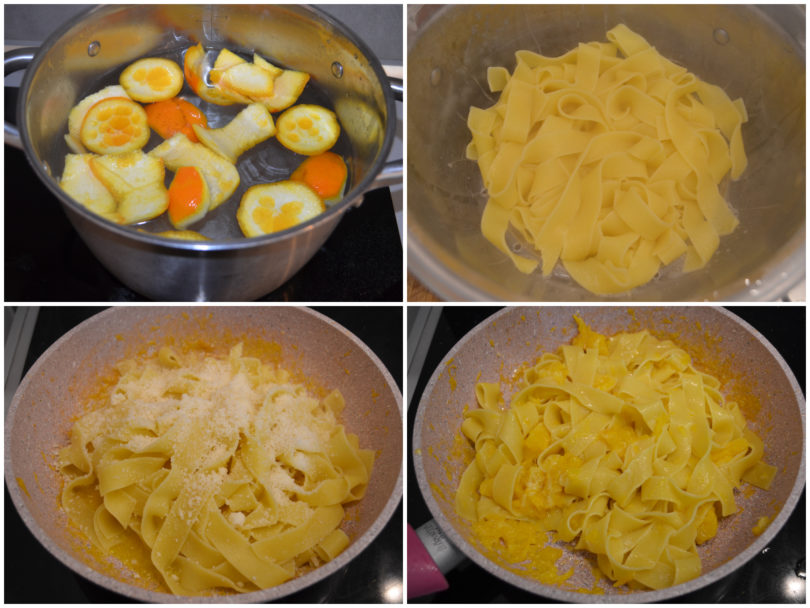 Mettete le bucce delle arance in infusione nell'acqua che userete per cuocere la pasta: una volta raggiunta l'ebollizione, eliminate le bucce e calate le tagliatelle.